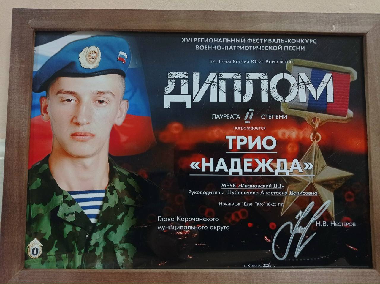 «Сердце помнит, не забудет никогда…» В г. Короча состоялся XVI региональный фестиваль-конкурс военно-патриотической песни «Сердце помнит, не забудет никогда…» им. Героя России Ю. Ворновского. Мы с гордостью сообщаем, что наши талантливые артисты, трио «Надежда», приняли участие в этом ярком и незабываемом фестивале. И по итогам выступления стали лауреатами ll степени. Поздравляем наших артистов с этим замечательным достижением и желаем им дальнейших творческих побед!